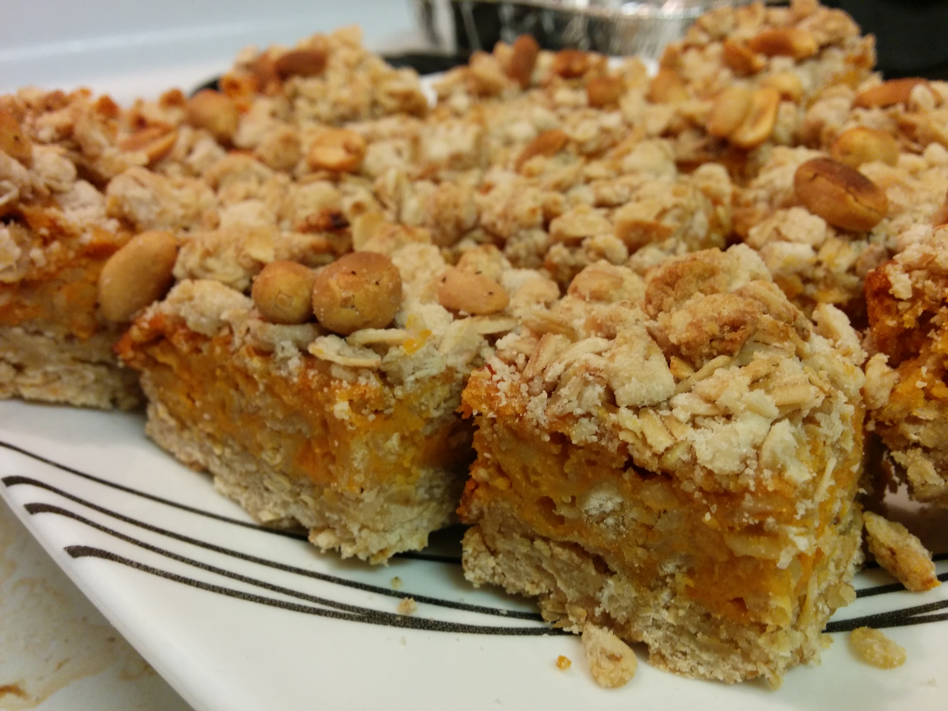 Sweet potato custard on oatmeal pie crust and nutty topping.
